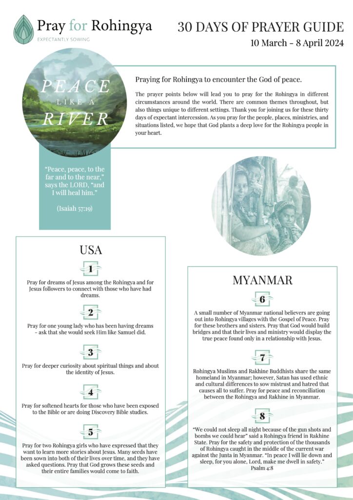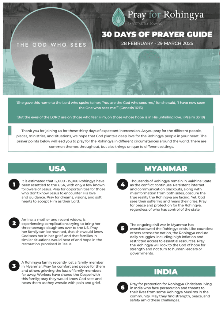 The 30 Days of Prayer for the Rohingya (2019) prayer guide is a helpful, 6-page PDF designed to be printed out to help you learn more about the needs of the Rohingya, be better informed, and pray more effectively on the go.